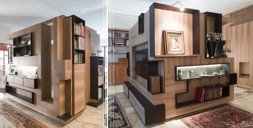 Cubalibro is an idea of multifunctional space provided using a single object. Cubalibro, is much more than a furniture, and also much more of an little interior architecture … Cubalibro represents an extreme synthesis of the concept of intelligent interior design. In a normal day, in a normal house, in a normal city, in a not-normal country, like Italy … a traditional client dreamed of having a new image in his home, but… without making big changes ! We could remove just one wall!!! … so… was born Cubalibro!