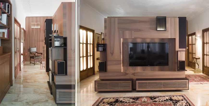 Cubalibro looks like a cubic volume, which have been removed some parts, to form various functional spaces. Load-bearing walls in wood have a cavity that allows the passage of electric cables for power, and for voice data and IT. Each face of the cube has a different theme that includes various functions: hi-fi and home theater, TV, reception, emptying pockets, library, service box, umbrella stands, and space inside the cube locker room and office.
