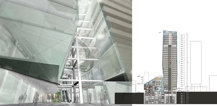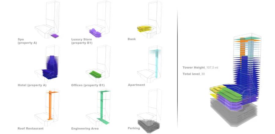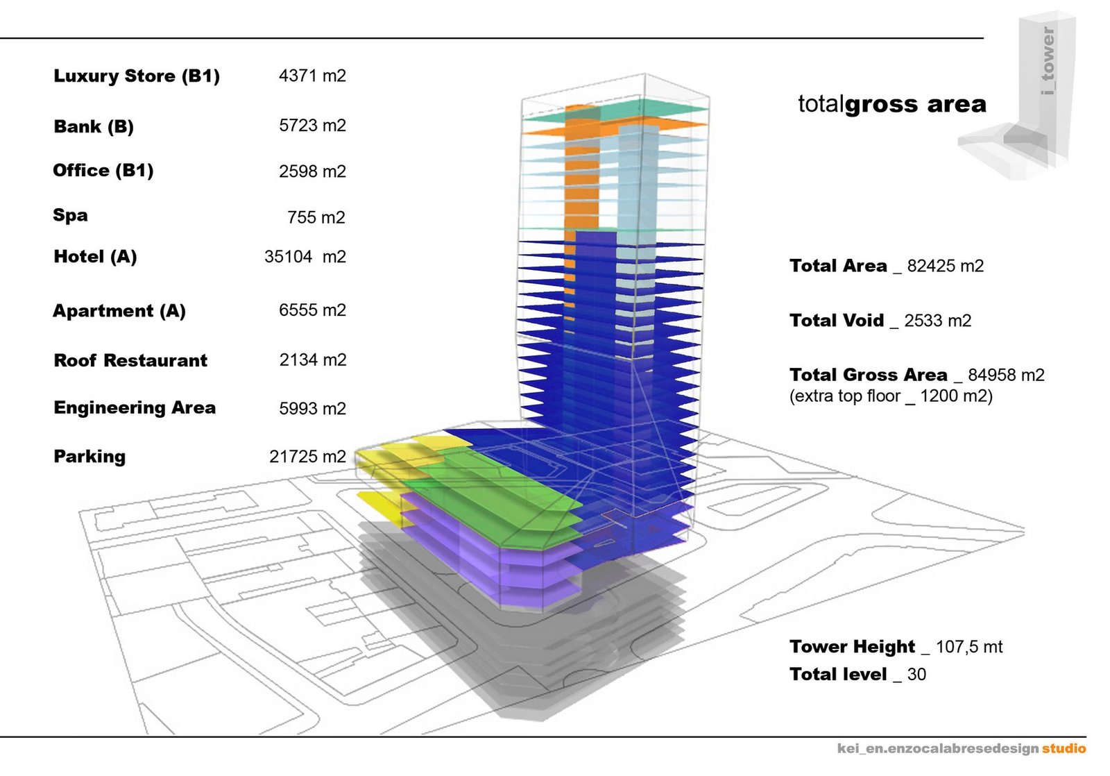 The Tower Project is located in the center of Sofia. It is a tower about 123 meters in height, with a total area of 80,000 m2 of which 50,000 out of the ground. The tower starts from a base of 6 underground levels of 5,000 m2 per floor, a large commercial podium, a 5-star hotel and a number of residences in the last 6 levels. Between the tower and the podium is a fascinating business interstitial space that dramatize the difference in height and contains all accesses to different functions. In 2011 he received the Building Permit, and probably will begin its construction.