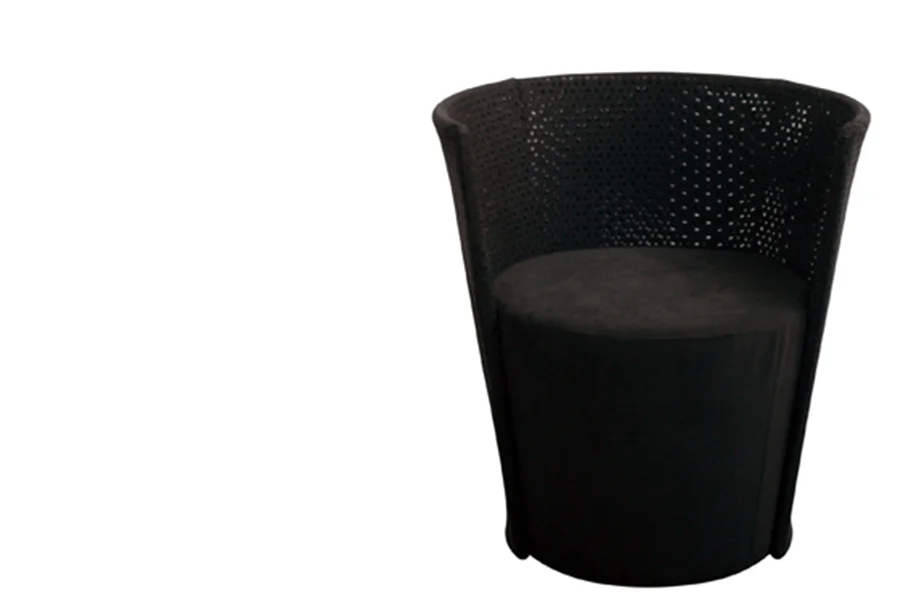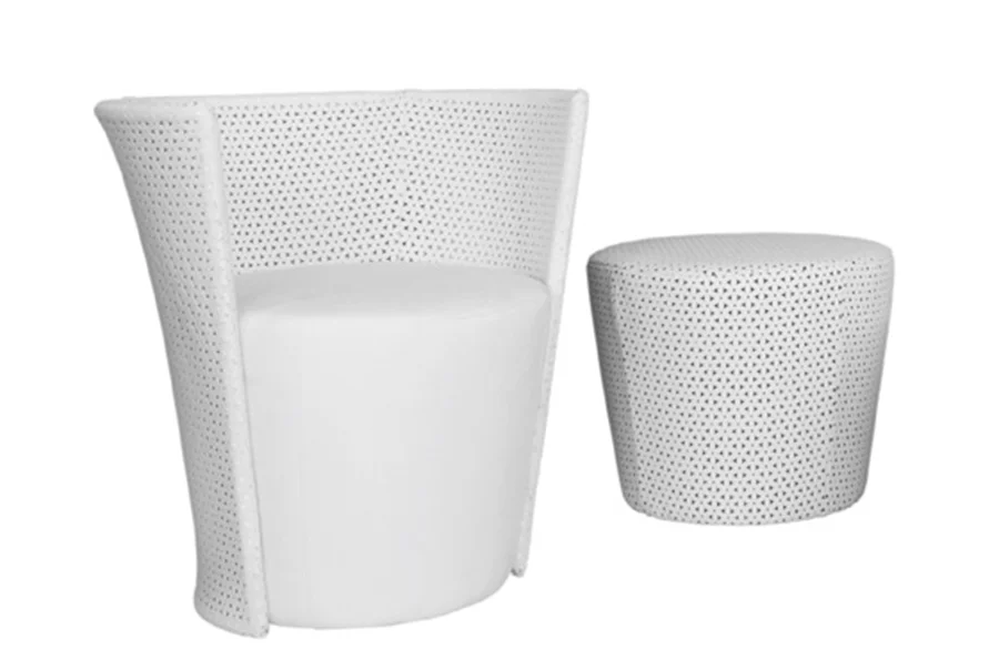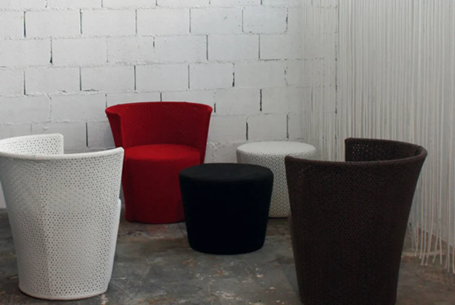 Onemore is a small armchair compounded by a structure and by a pouf which can be used as individual seat or small table. The structure is in curved metal tube, painted; the encasement is made by perforated Alcantara fabric, cut by laser.
