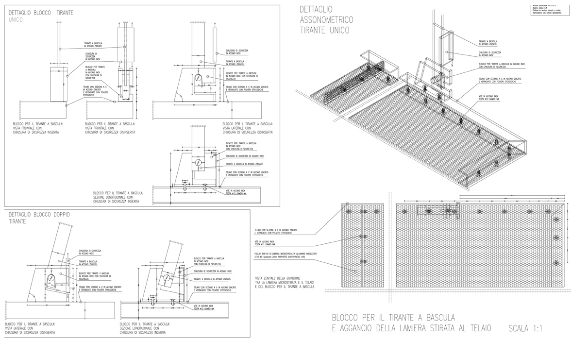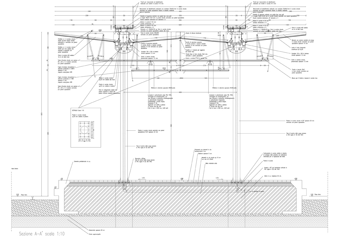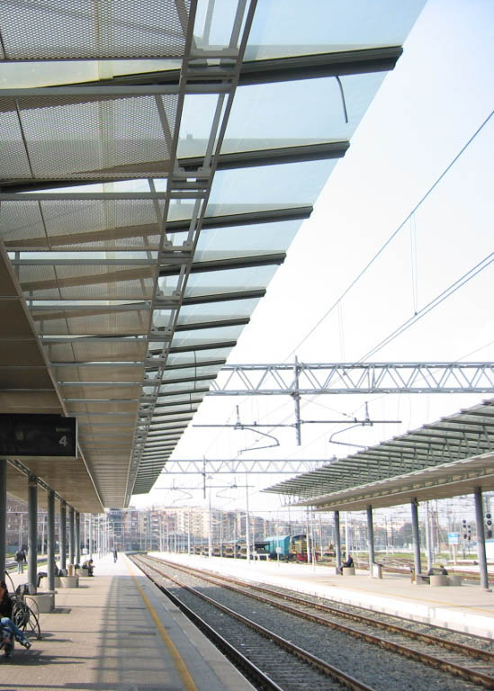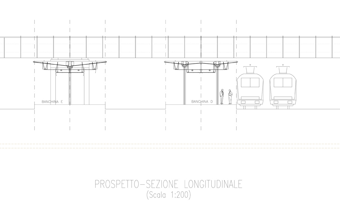 The canopy is composed by a still structure that sup- ports glass and perforated panels. This solution wants to answer to the needs of visibility for the new station, as well as rain and sun shelter. This light and complex structure accommodates signs, electrical and plumbing systems as well.