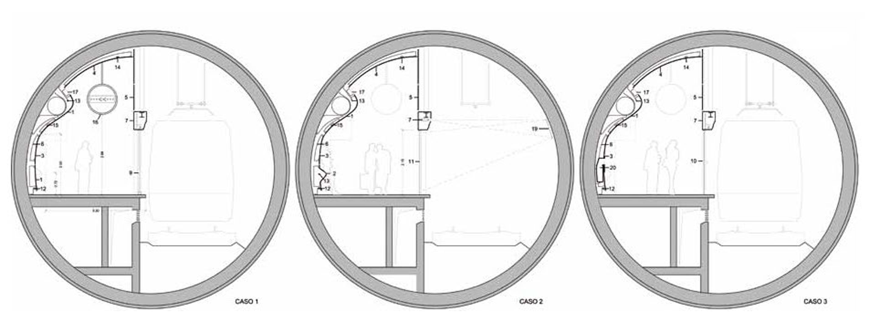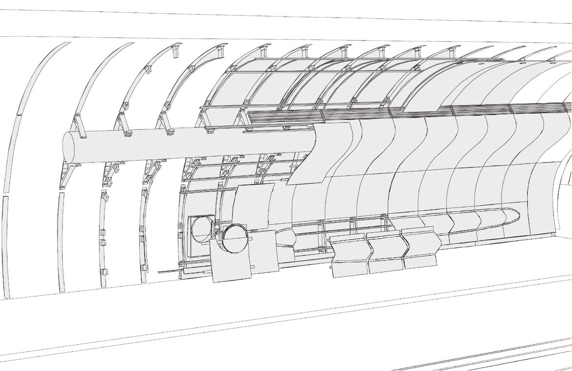 The idea was to create a fluid physical environment in relationship with flows, typical of a station. The tunnel is coated by undulated panels that covers the plant along the concave walls. Furthermore this kind of structure creates a sequence of sits in some points and garbage bins in others, directly integrated with the coated wall.