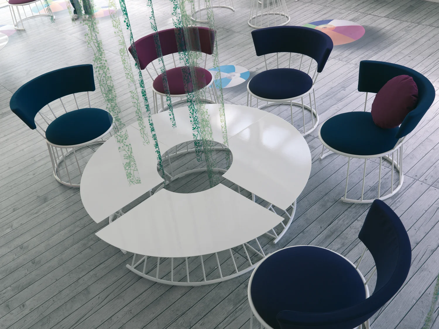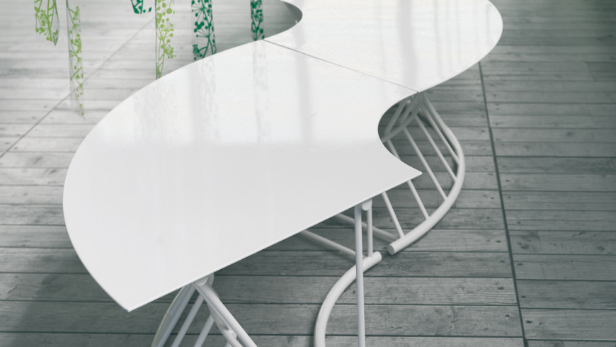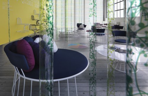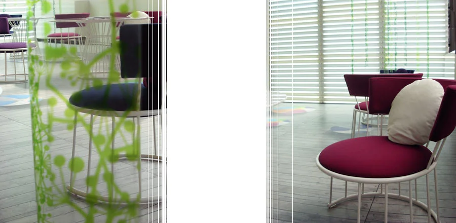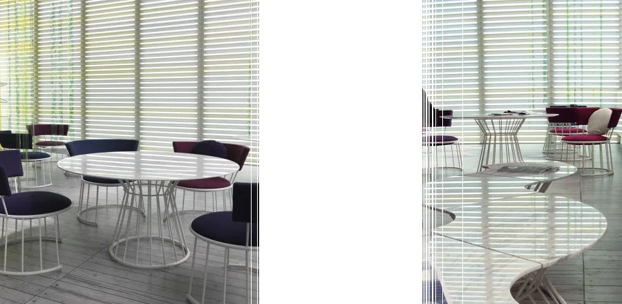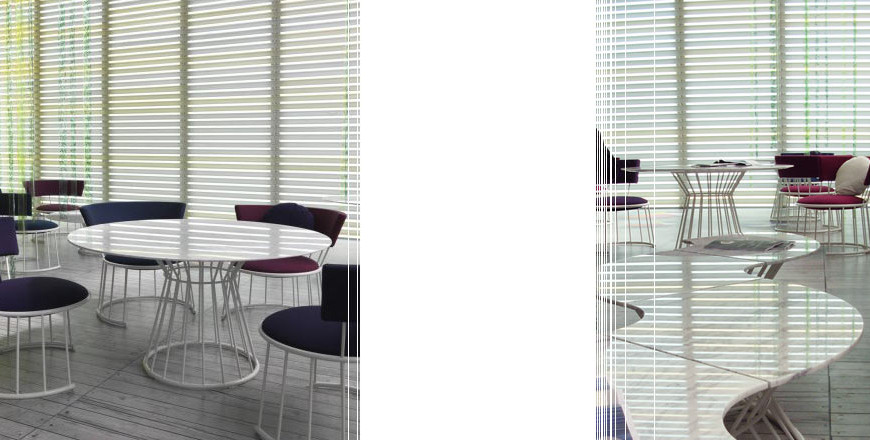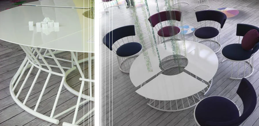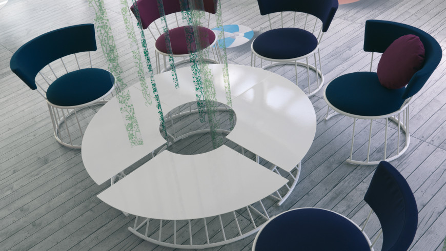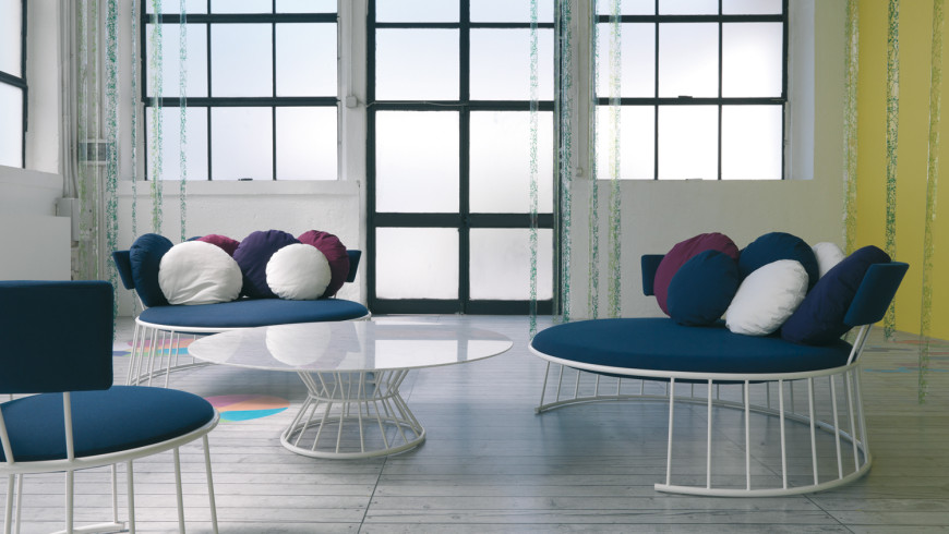 Frame in tubular steel with lacquer finish in various colours. Table top in white Carrara marble. Seat and back padded in non-deformable polyurethane foam with fabric covers.